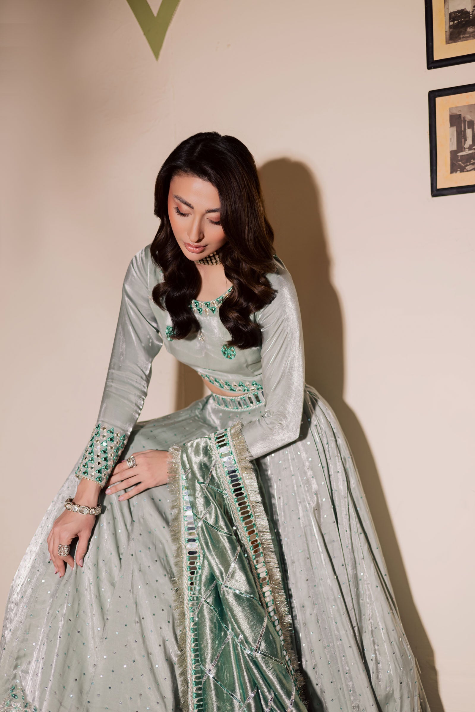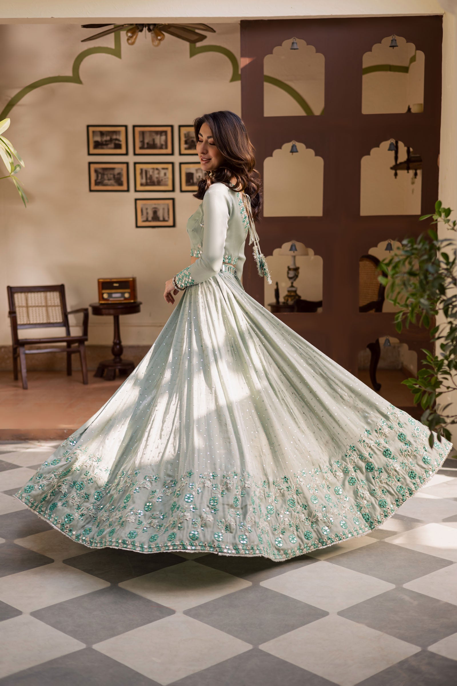 A graceful pastel green lehenga choli set, beautifully crafted with a fully lined lehenga supported with can-can for a structured yet flowing silhouette. The lehenga features mirror and Kota work, enhanced with an all-over hand embellished Sitara spray in matching green and silver tones.