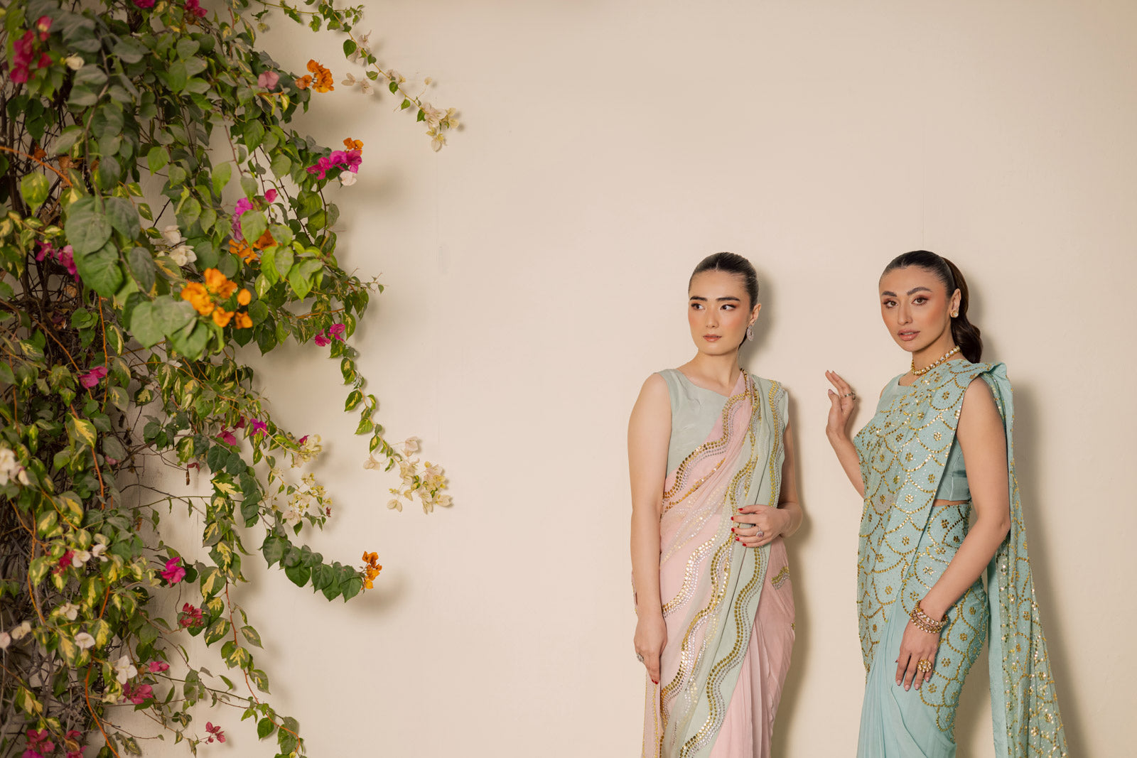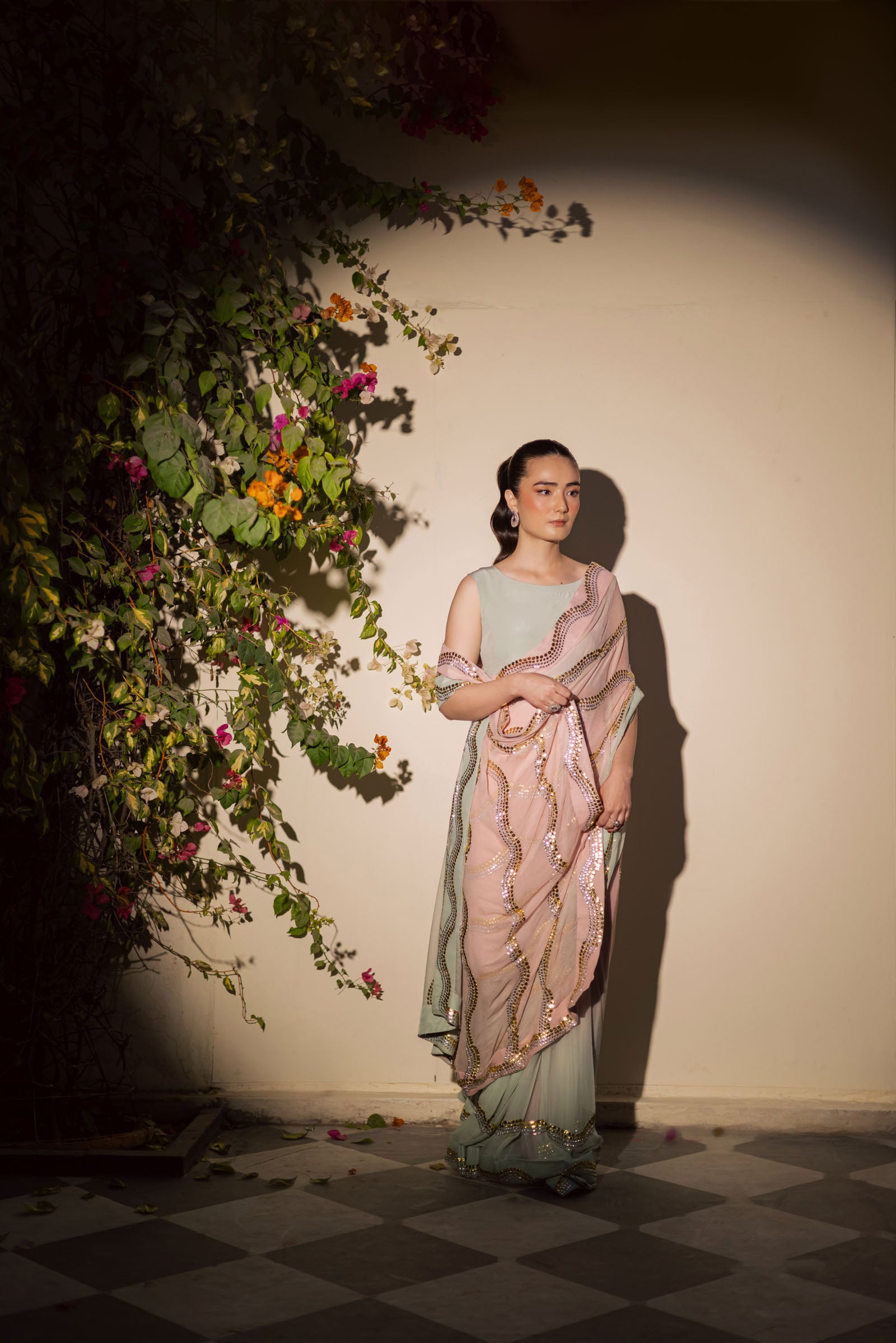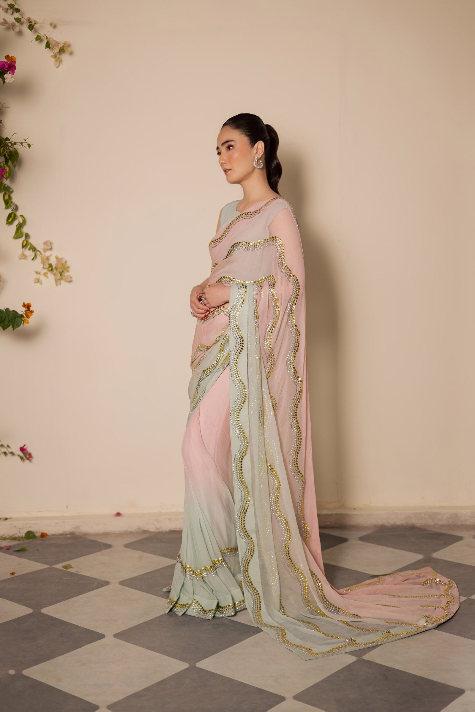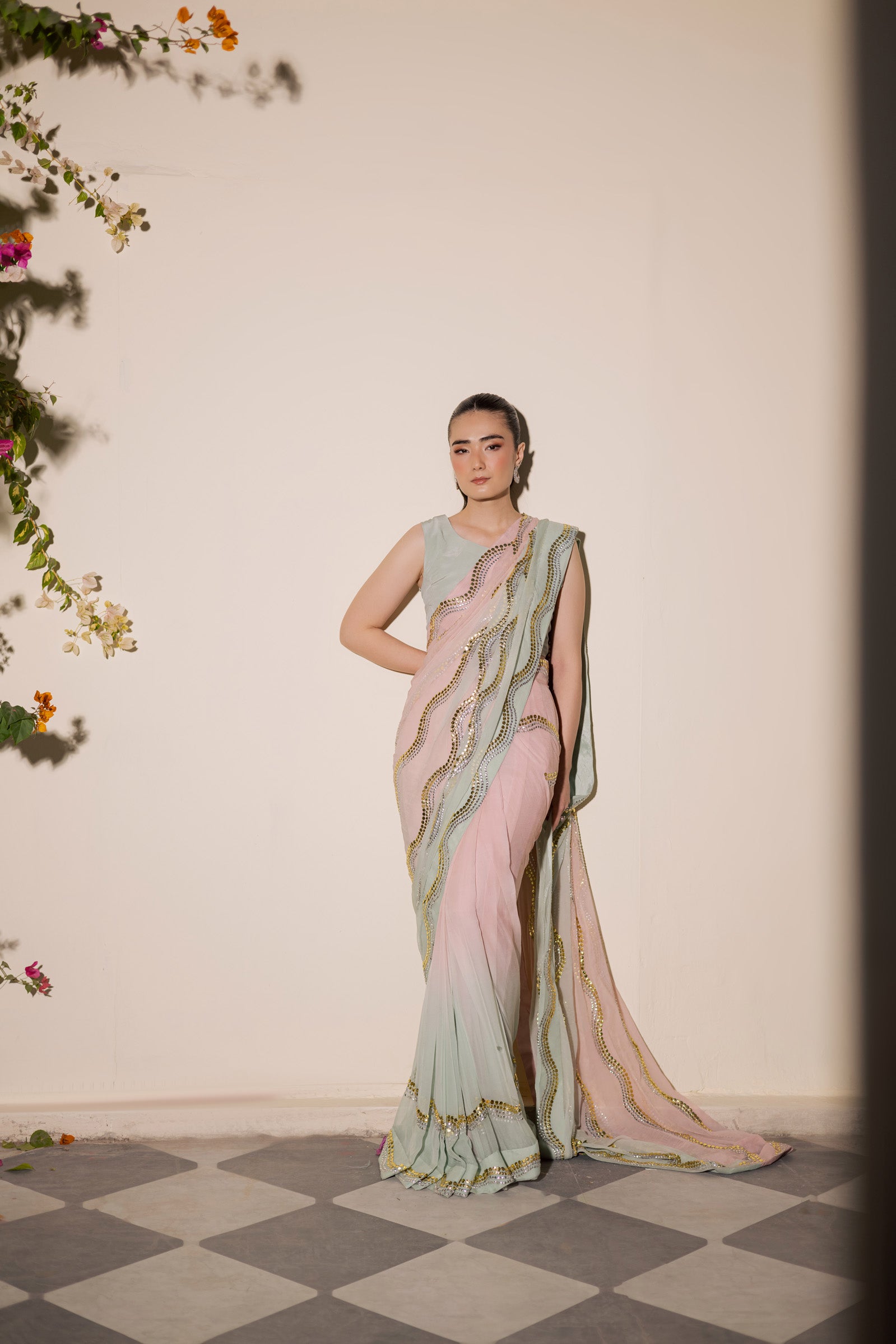A delicate powder pink saree beautifully contrasted with a soft pastel green border, creating a refined and refreshing color harmony. The pallu is adorned with Mukesh wavy line patterns in subtle silver and gold tones, echoed along the saree borders for a graceful, flowing finish.