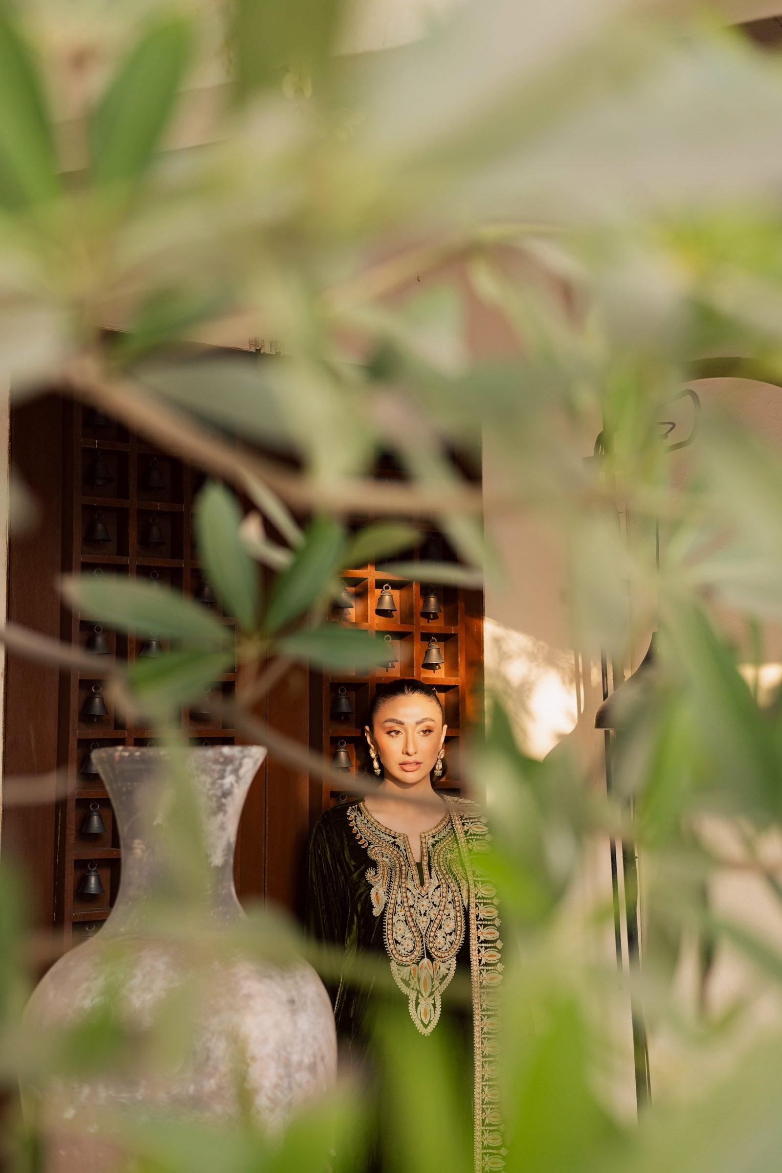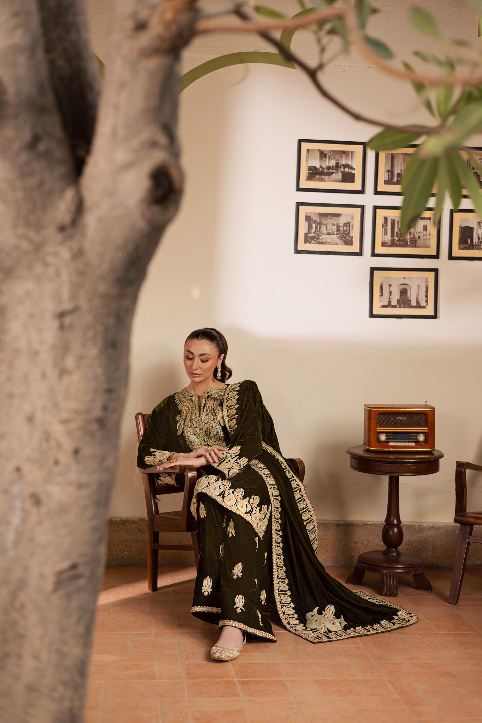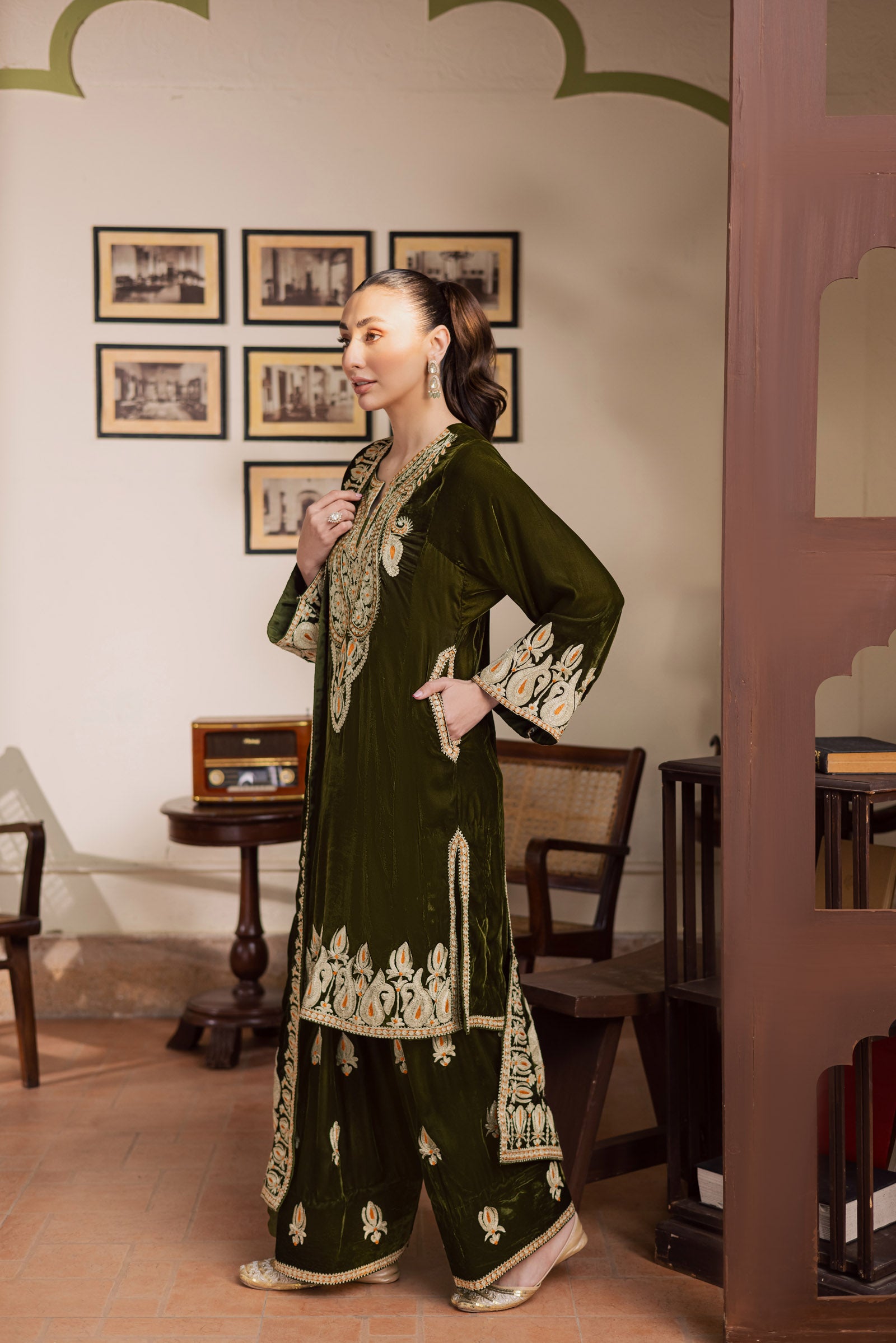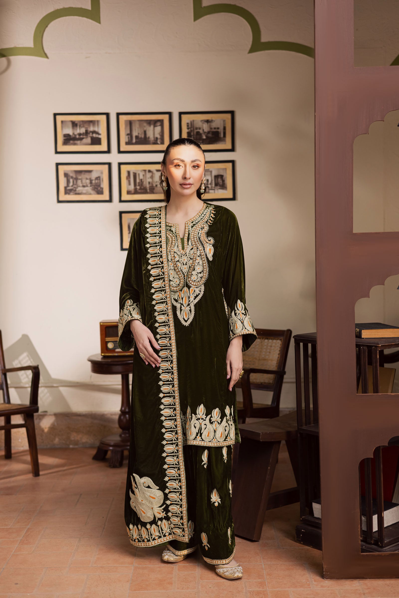 A classic green velvet outfit expertly made with intricate details. The phiran and shalwar are embellished with subtle Dori work, enhanced with light gold Tilla, creating a luxurious yet refined look. The neckline and shirt borders showcase refined Ari embroidery, adding dimension and definition to the silhouette.