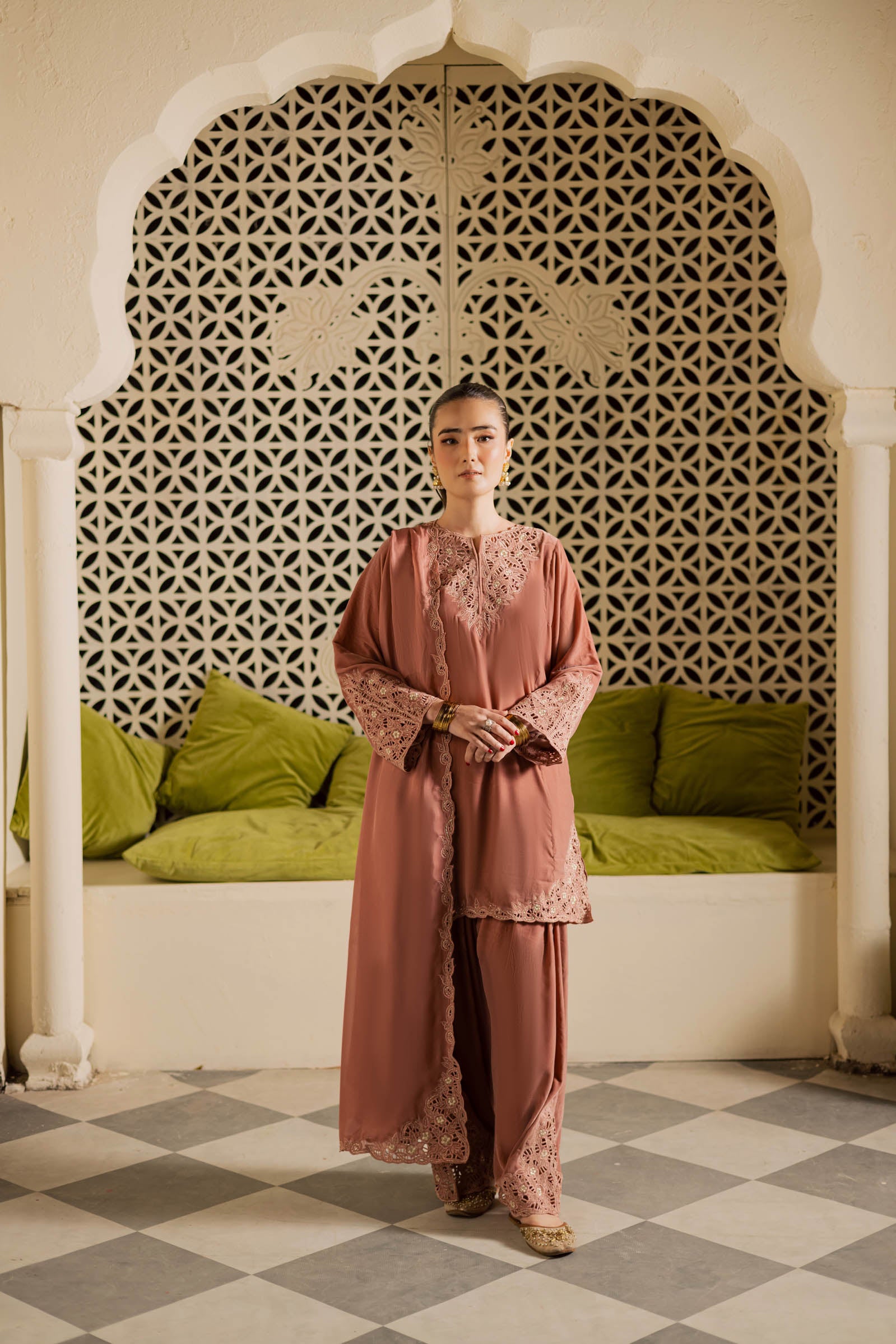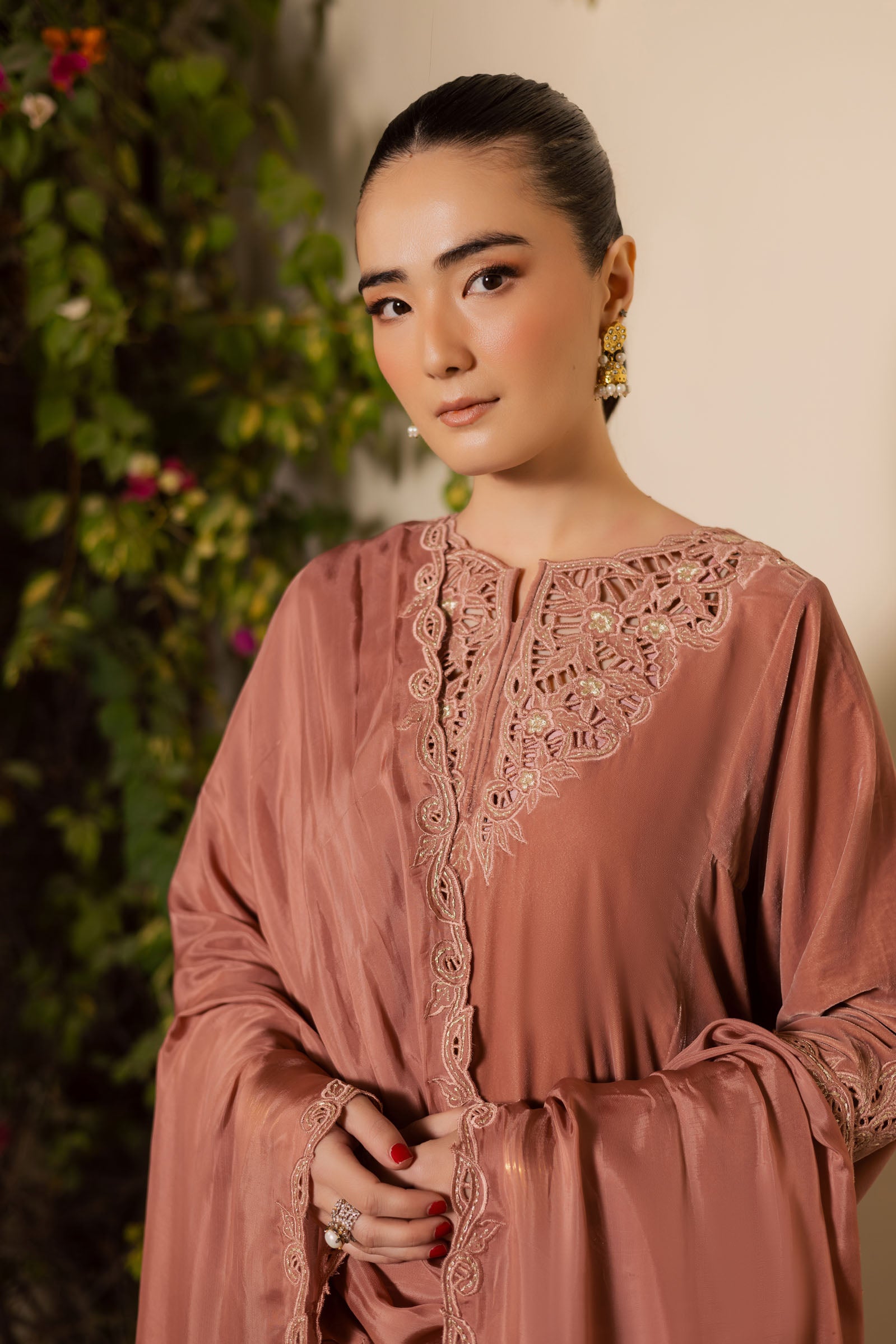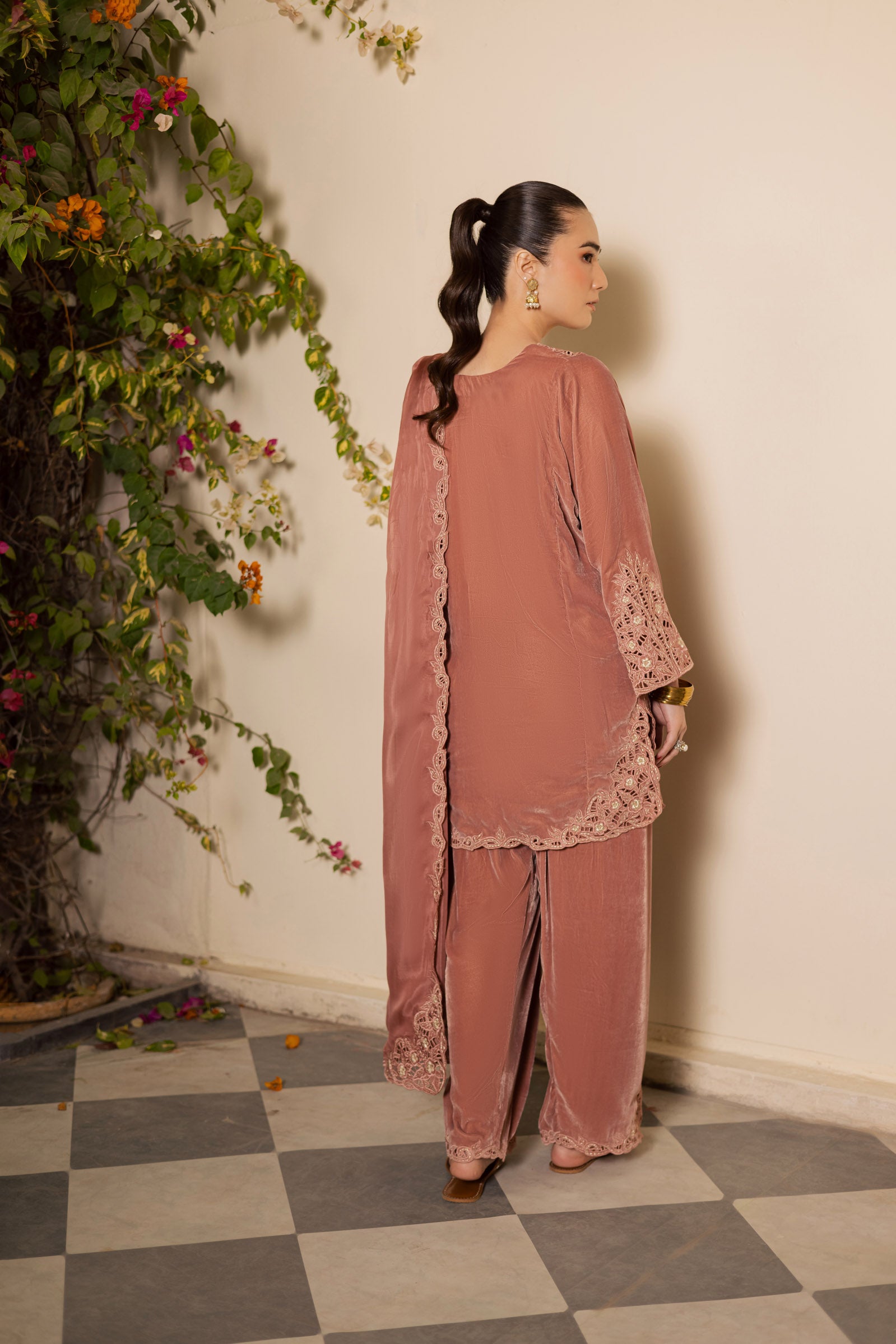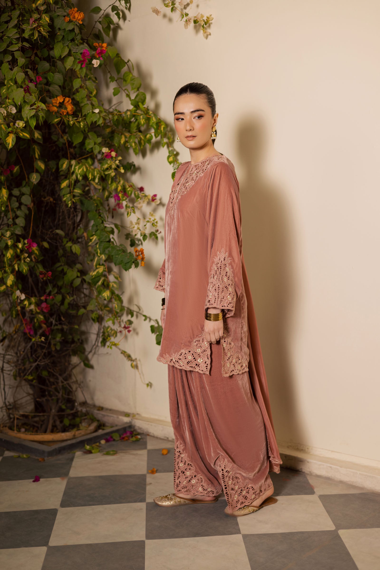 A delicate tea-pink velvet ensemble, exquisitely designed for timeless elegance. The outfit features intricate cutwork with matching Resham embroidery on light golden Tilla, adorning the neckline, shirt hem, side slits, and shalwar. The sleeves are elegantly finished with corner motifs and subtle shalwar detailing.