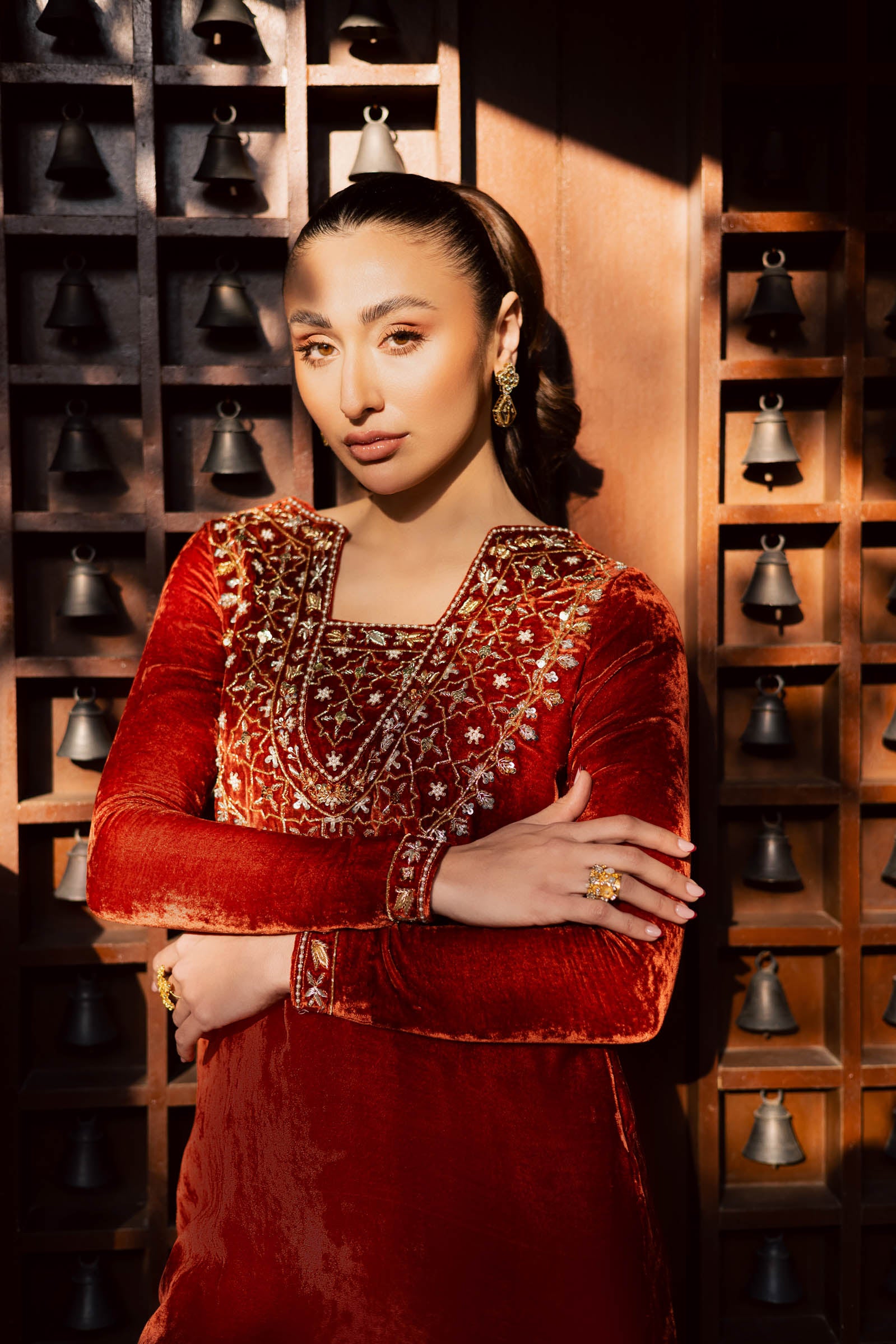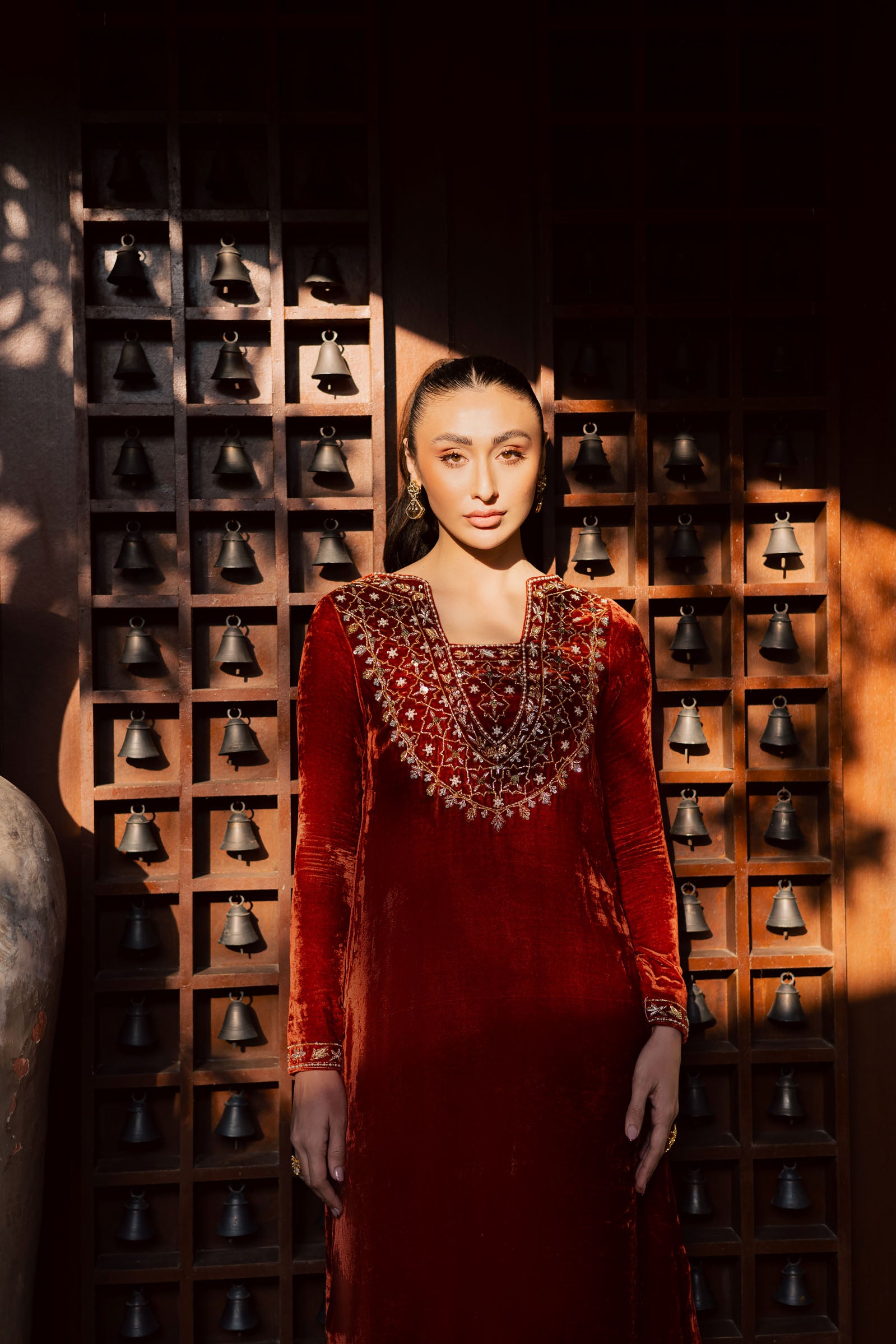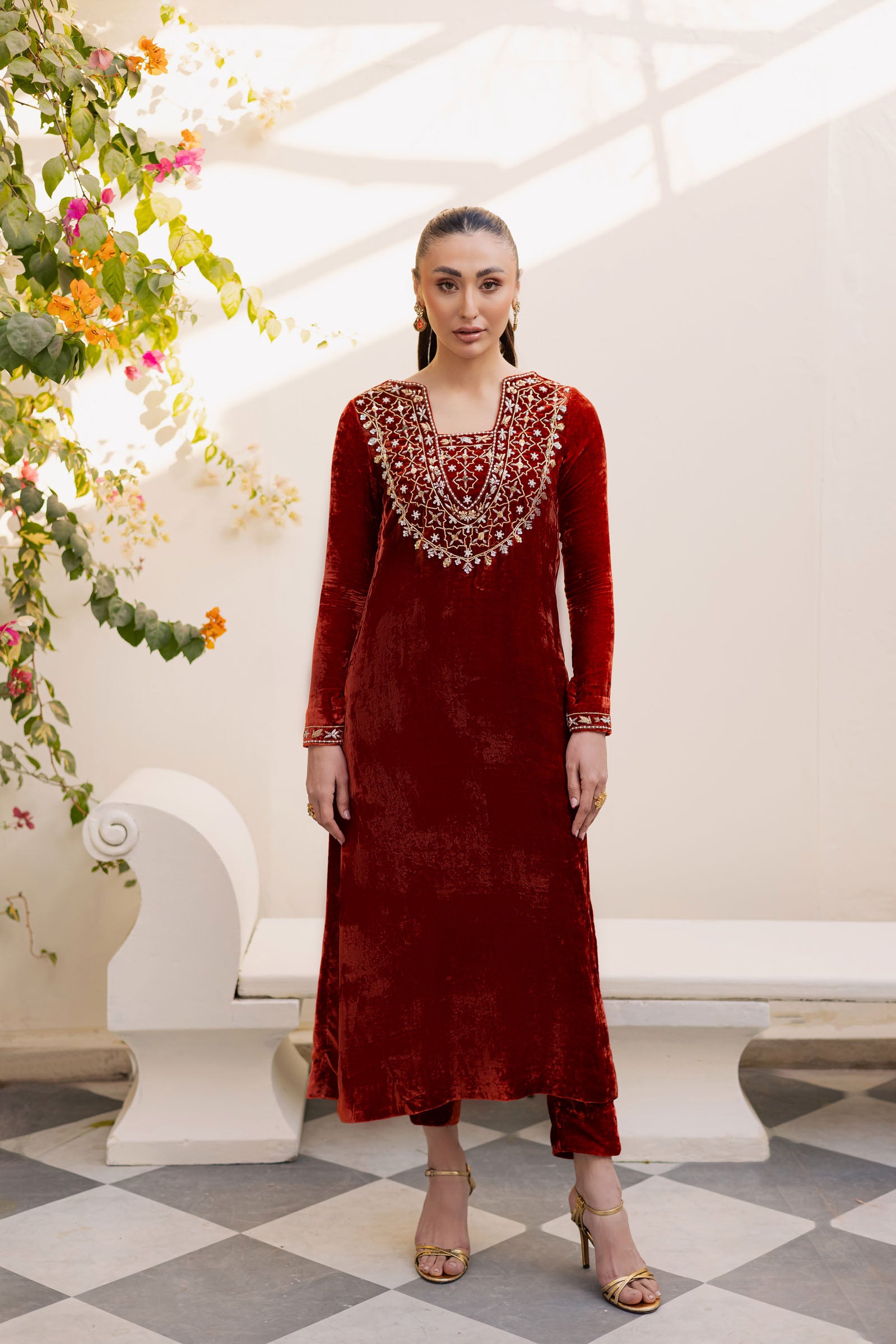 The neckline and sleeves are adorned with hand embellishment work, including Dabka and Sitara embroidery, showcasing exquisite craftsmanship. The soft, rich velvet fabric adds a luxurious touch, making this dress ideal for both formal .