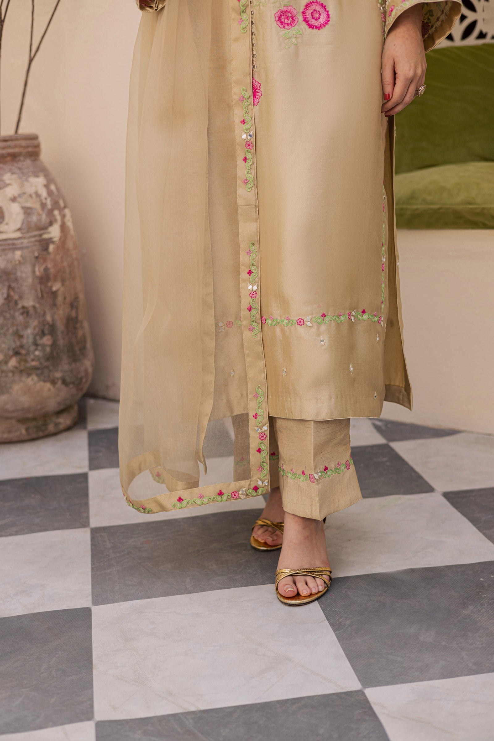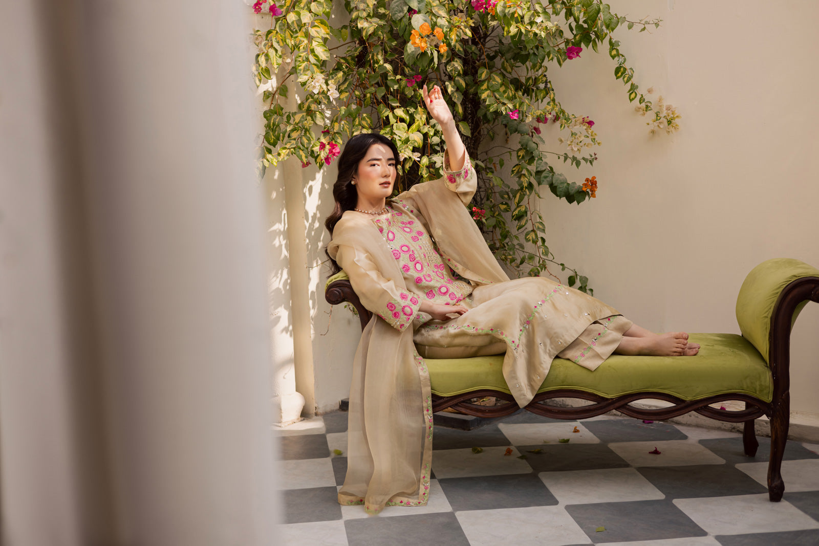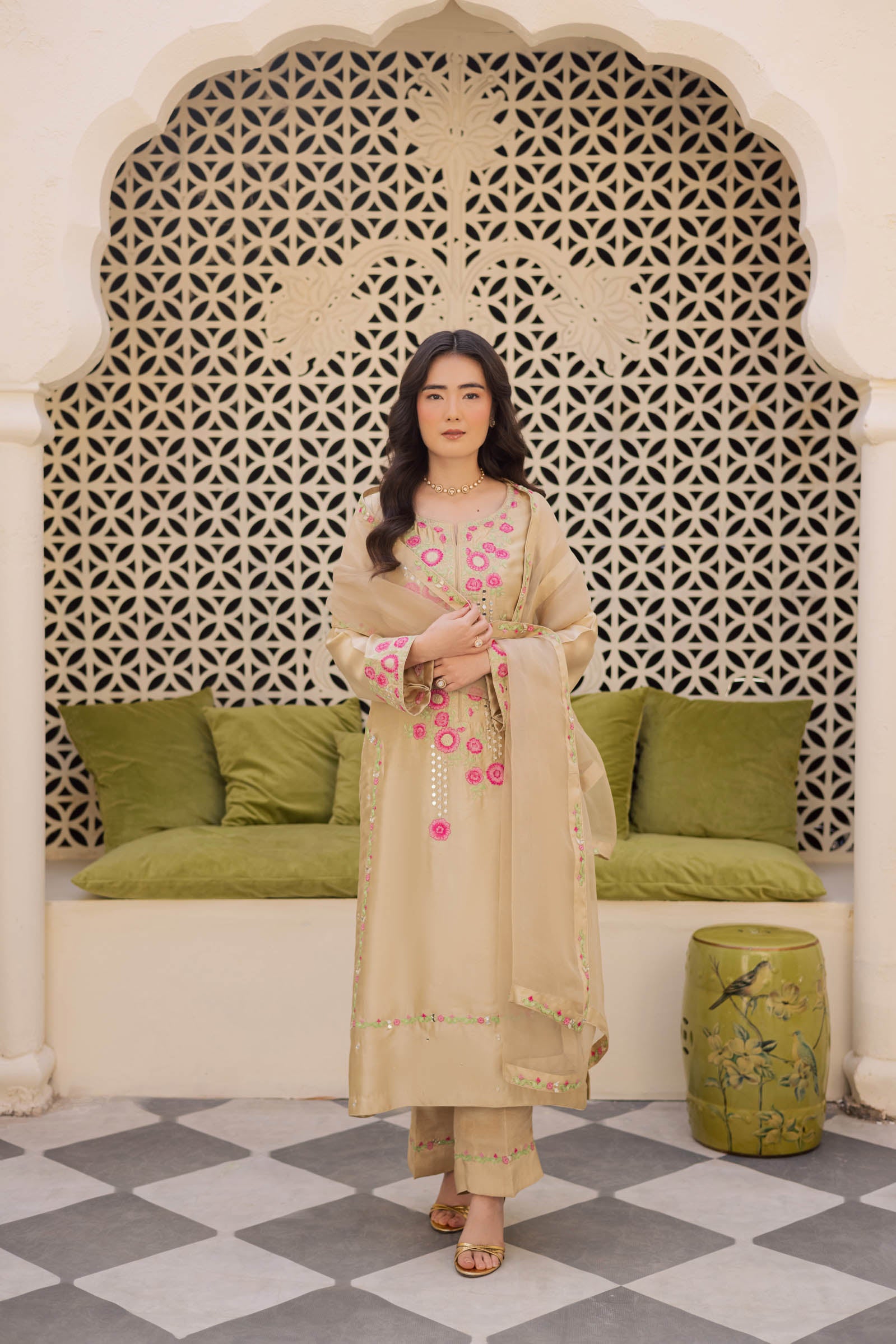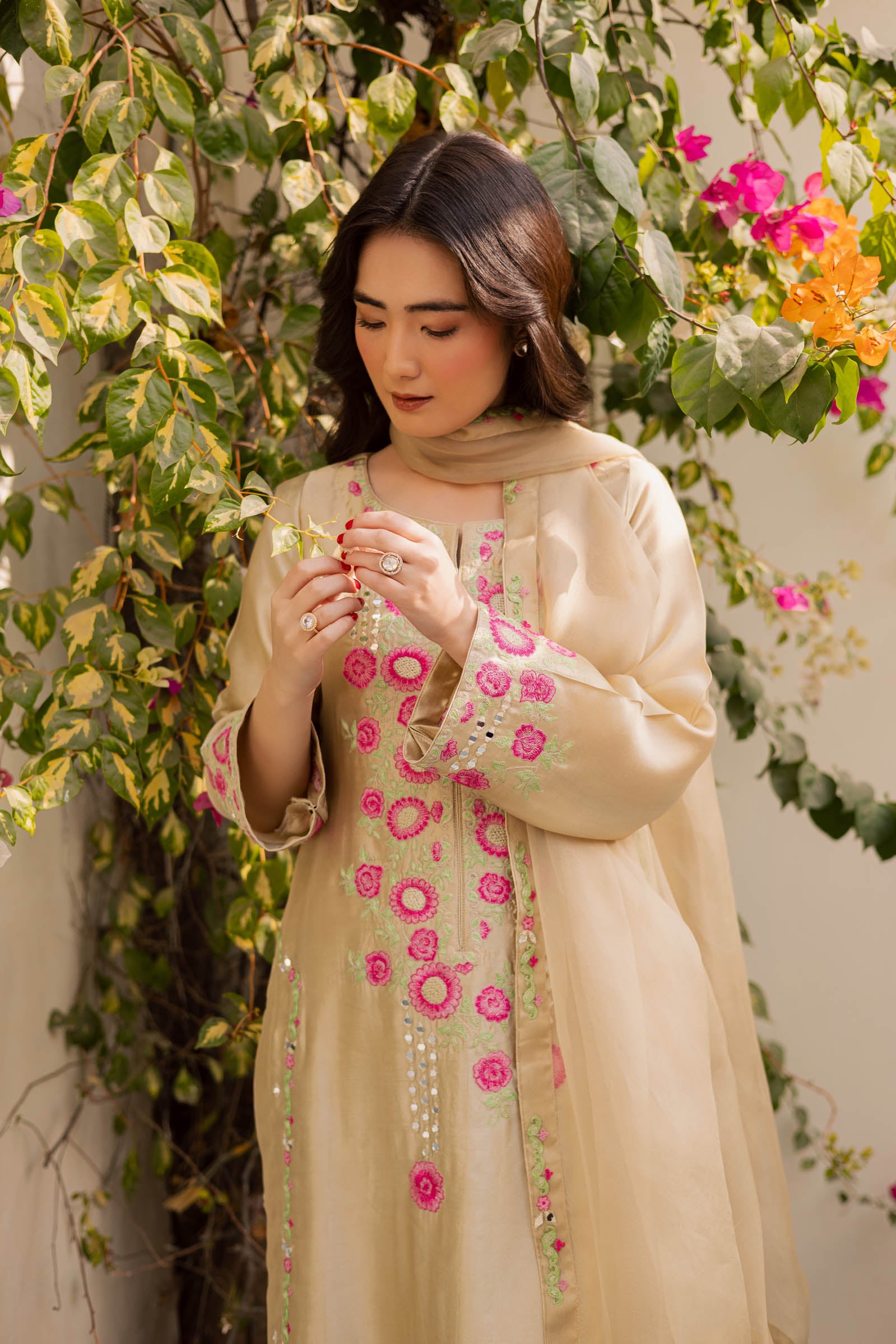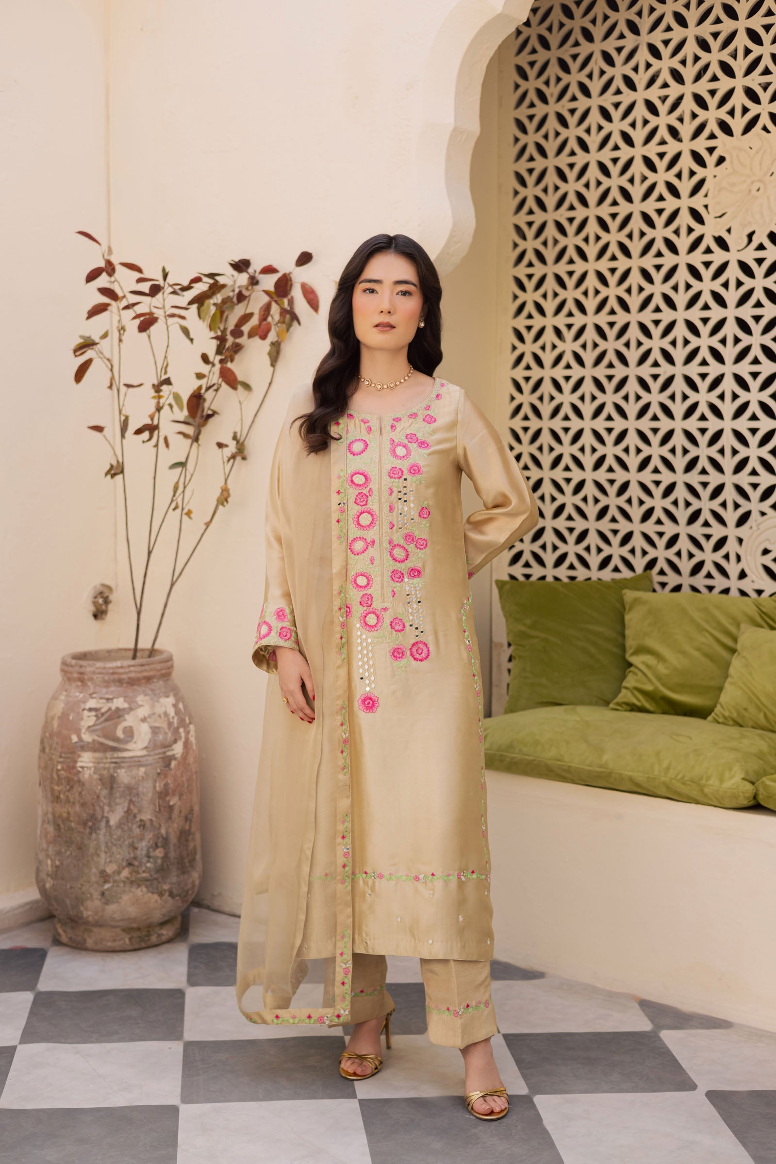 A sophisticated skin-colored outfit made from pure Shisha Silk and adorned with exquisite hand and machine embroidery along the neckline. The embroidery showcases lovely shades of pale pink, deep pink, and muted green, embellished with subtle mirror work that adds a refined and subtle radiance.