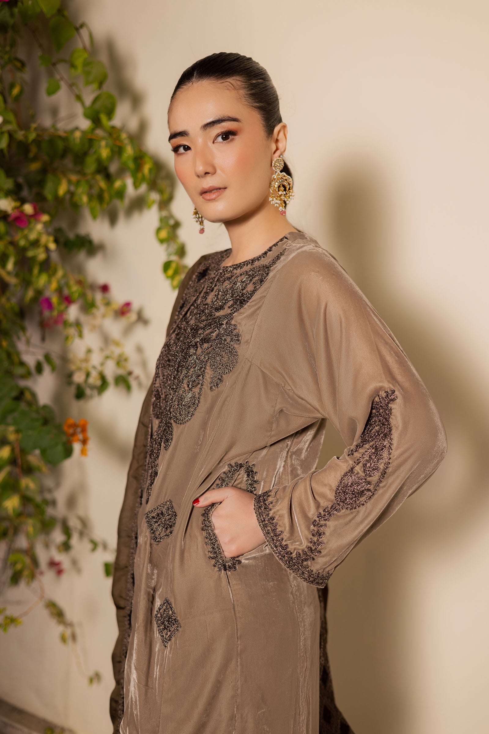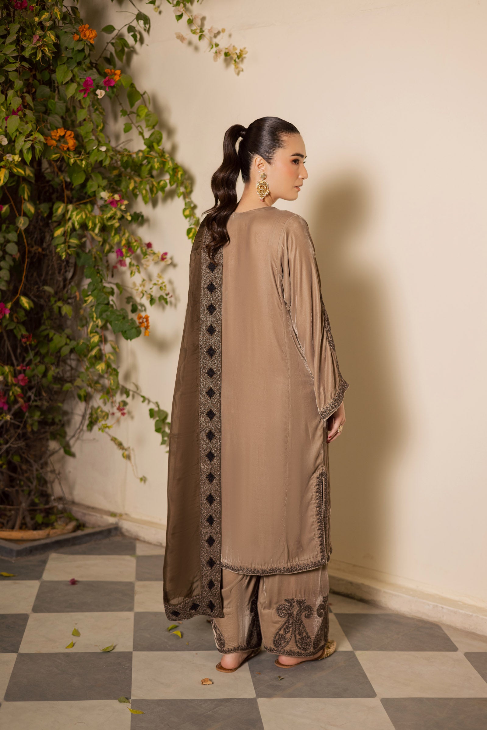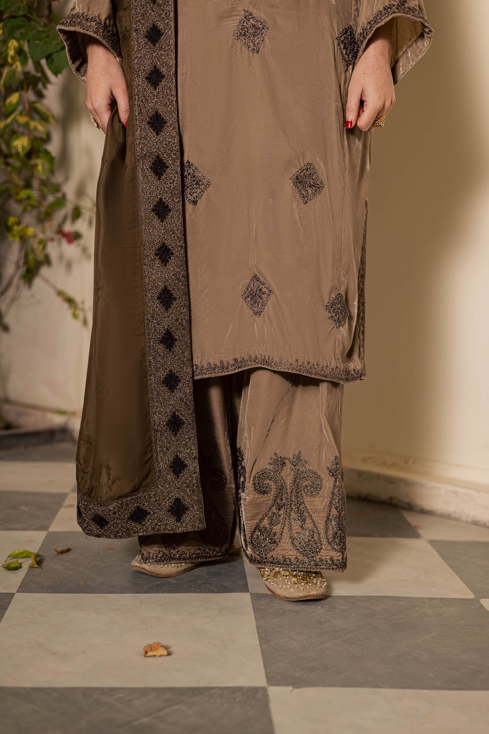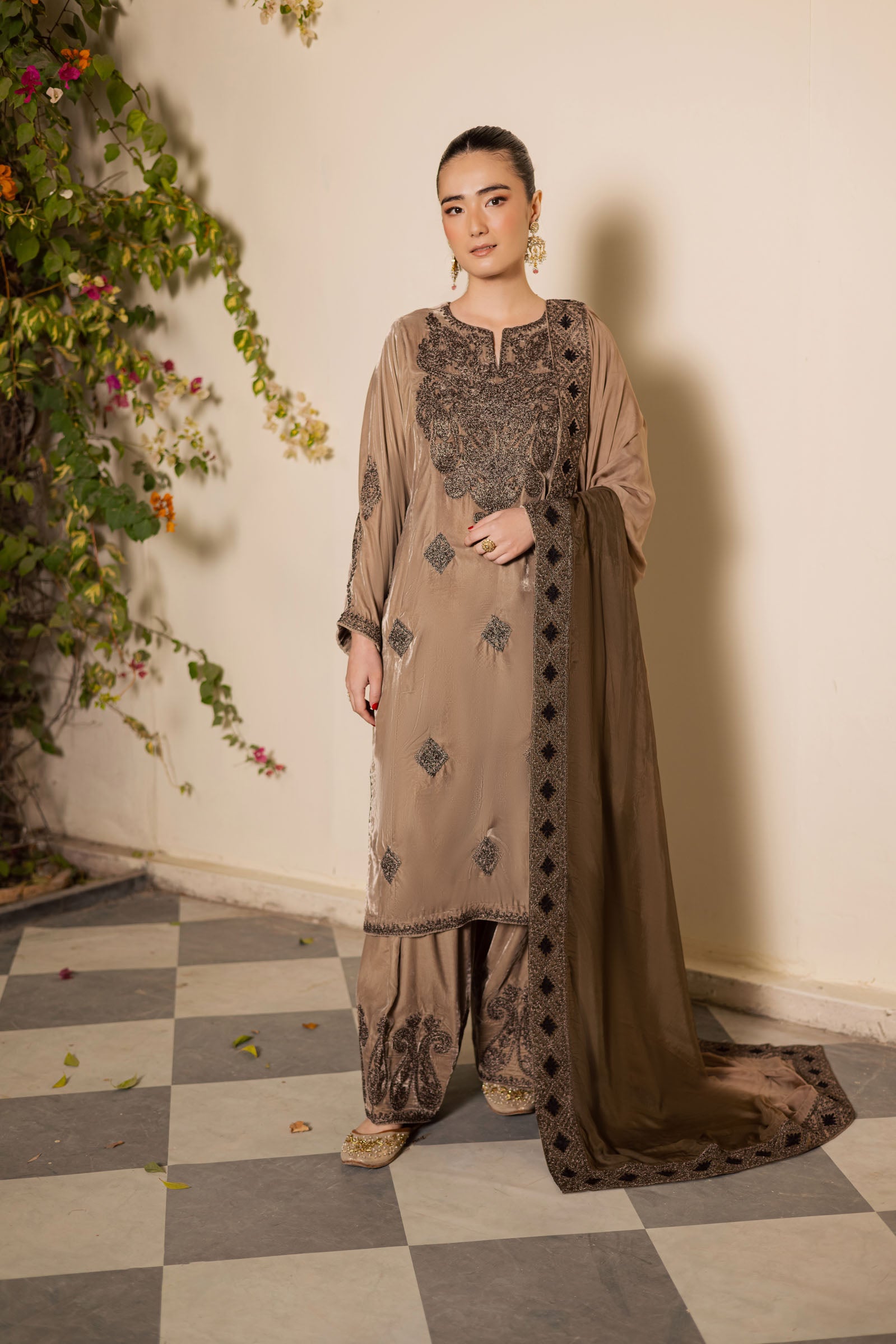 A soft, ethereal blend of light skin and ivory shades, this exquisite velvet outfit is adorned with metallic Tilla embroidery on the neckline, shirt hem, and bootis across the shirt, with matching detailing on the shalwar border. The ensemble is complemented by a two-tone medium silk dupatta, featuring a four-sided border and delicate Dori work throughout, harmonizing with the shirt’s embroidery.
